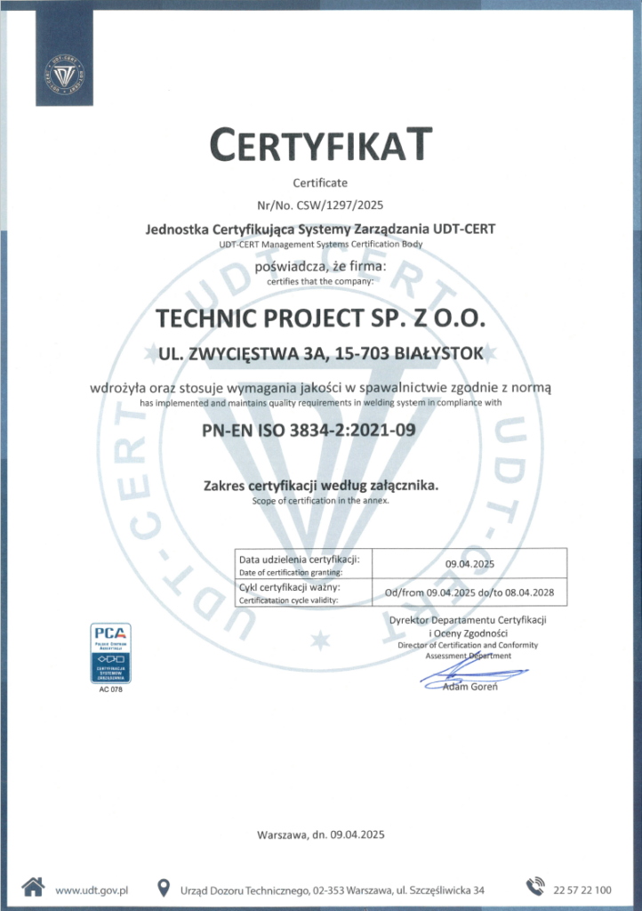 Firma Technic Project Sp. z o. o. pozytywnie przeszła proces certyfikacji i uzyskała certyfikaty potwierdzające spełnienie norm EN-PN 1090-2 do klasy EXC3 oraz EN-ISO 3834-2 co świadczy o wysokiej jakości wykonywanych produktów. Dzięki uzyskaniu wyżej wymienionych certyfikatów firma Technic Project jest dostawcą elementów stalowych wykorzystywanych w budownictwie, konstrukcji stalowych oraz może oznaczać swoje produkty znakiem CE. W trakcie procesów produkcyjnych wykorzystujemy oprogramowanie CAD oraz urządzenia takich producentów jak Kemppi, Migatronic, MTP.